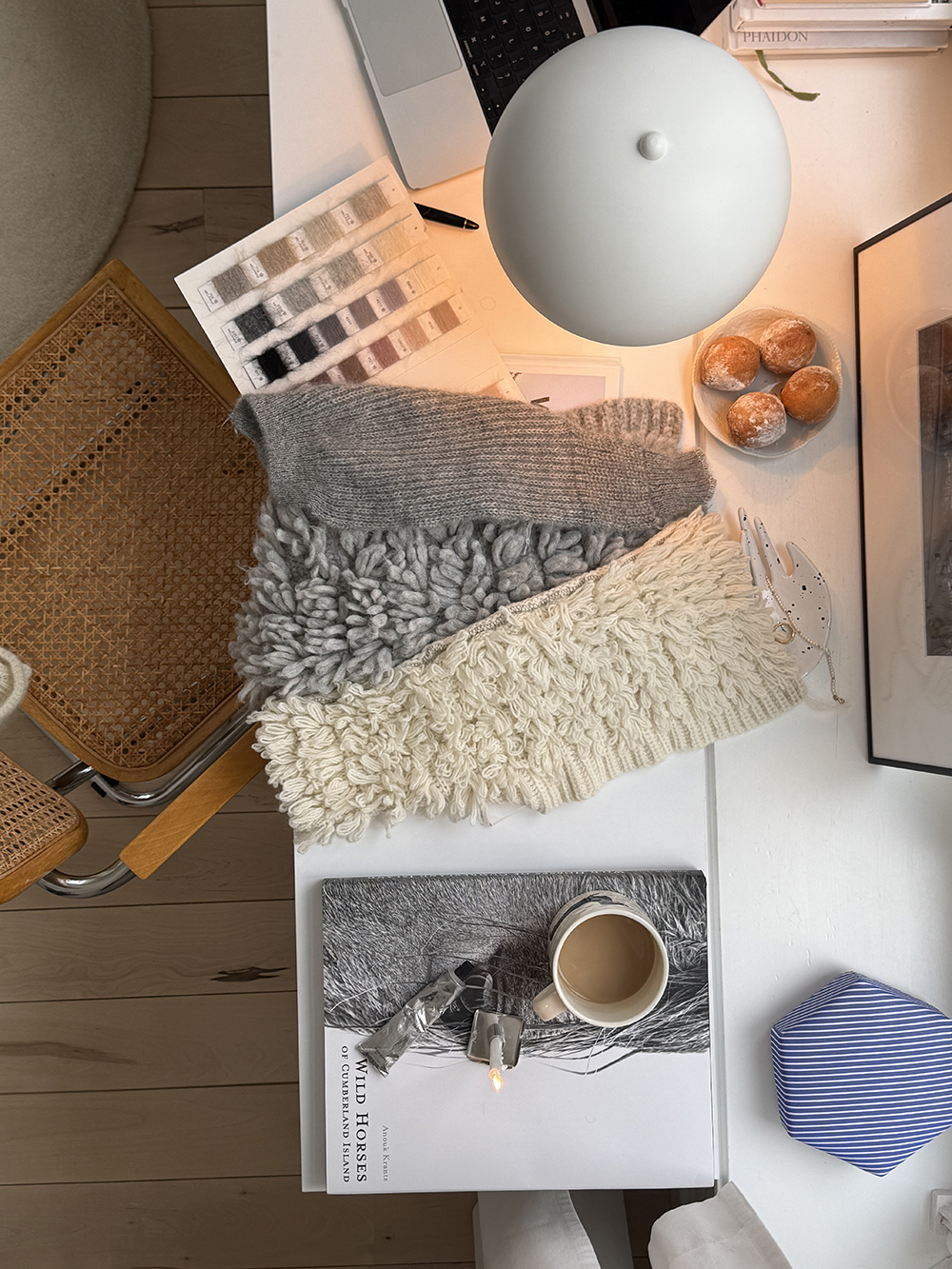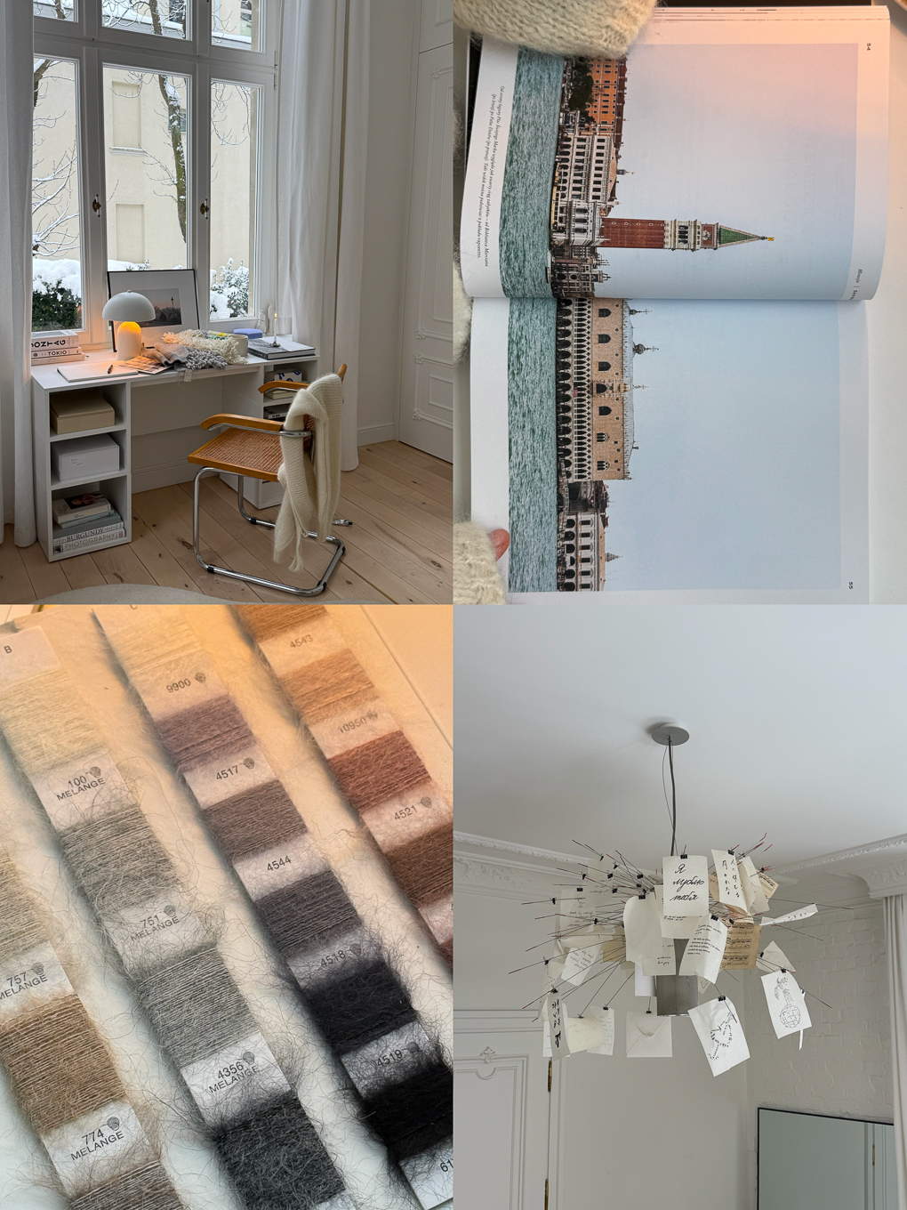 1. Praca z domu oznacza mniej więcej tyle, że przygotowujesz sobie biurko, ale prawie w ogóle przy nim nie siadasz. // 2. Moja pierwsza książka w 2026 roku to…. ta książka jest jak namiastka prawdziwej podróży. Uwielbiam koncepcję tej serii przewodników, a Wenecja to chyba mój ulubiony (mam jeszcze Paryż i Tokio). // 3. Pogoda sprzyja tworzeniu kolejnej zimowej kolekcji :). // 4. Chyba czas o Ciebie zadbać, bo jesteś jakaś taka potargana. Ta lampa to jedna z tych rzeczy, która chyba nigdy mi się nie znudzi. //
