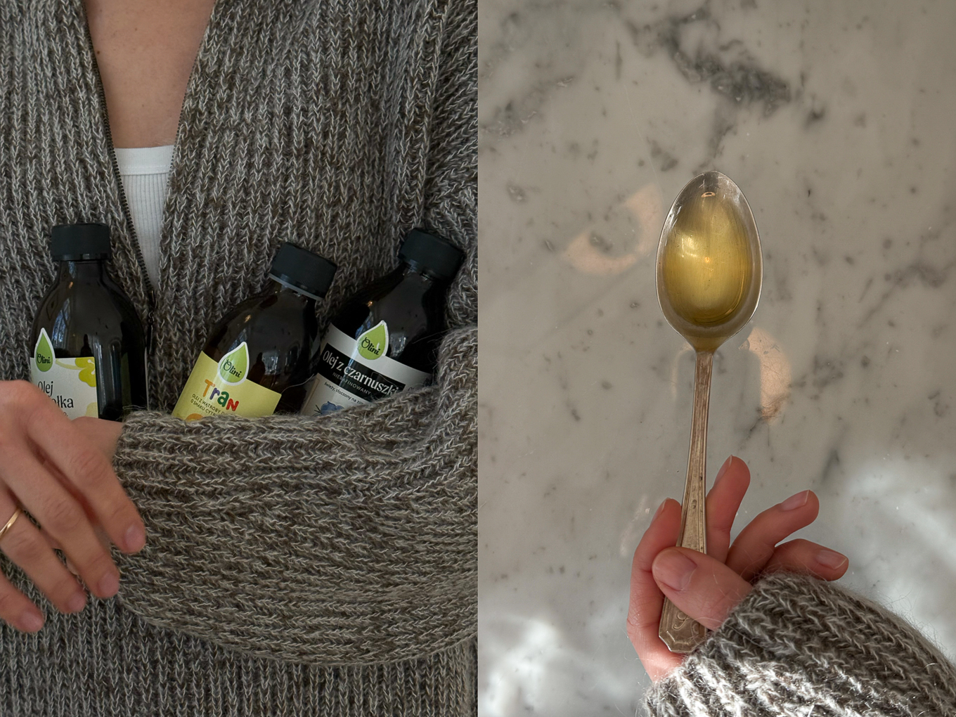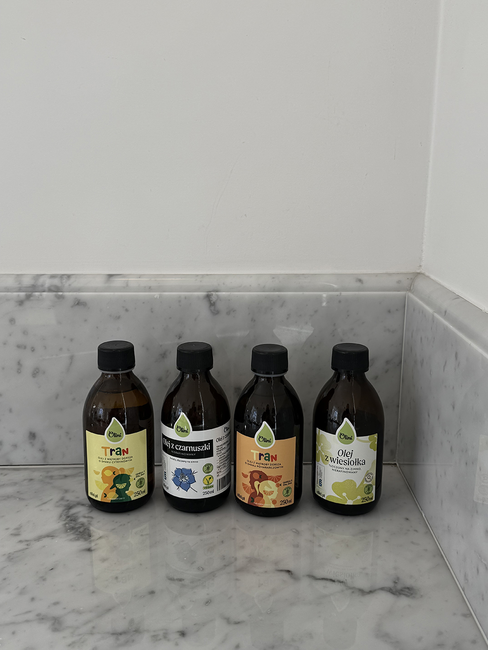 Na mojej tacy z olejami znajdziecie też olej z wiesiołka (świetny do sałatek albo smoothie), olej z czarnuszki (ten piję w formie shota, bo ma bardzo intensywny smak, ale uważam, że warto – jego udowodnione właściwości prozdrowotne naprawdę robią wrażenie) i tran o smaku pomarańczowym (do owsianek i innych słodkich śniadań, pasuje nawet do naleśników).