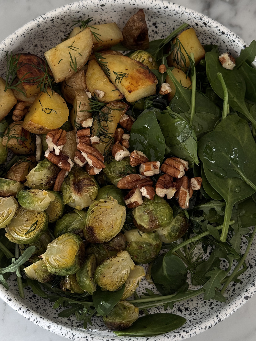 Warzywa dokładnie myjemy. Brukselkę obieramy i kroimy na pół. Ziemniaki porządnie szorujemy i kroimy na kawałki. Zaczynamy od ziemniaków, które obtaczamy w oliwie, paście Miso, soli i odrobinie przypraw. Najpierw wrzucamy na blachę ziemniaki na 20 minut (w 180 stopniach) a po upływie tego czasu, dodajemy brukselkę skropioną oliwą i doprawioną solą i pieprzem. Gorące warzywa wrzucamy na talerz razem ze szpinakiem i rukolą. Doprawiamy solą, pieprzem, dorzucamy koperek oraz ulubione orzechy, a na koniec polewamy wszystko tranem od Olini (w ogóle nie ma zapachu ryby, a cytrynowy posmak, świetnie podbija smak dania).