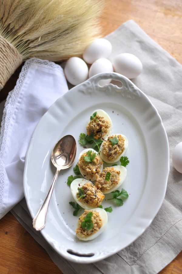 Jak co roku na naszym stole wielkanocnym nie może zabraknąć faszerowanych jajek. Jest ich kilka rodzajów, bo każdy ma swoje ulubione. Począwszy od tych podsmażanych na masełku w bułce tartej, po piękne różowe barwione w soku z buraków. Dzisiejsze są dość specjalne, bo z dodatkiem świeżego koziego sera, który jeszcze wczesnym rankiem był pakowany przez gospodarzy z naszych kaszubskich terenów, skąd wywodzą się jego tradycje. W pomorskich gospodarstwach wytwarza się je ręcznie, tradycyjnymi metodami, co nadaje im regionalnego, niepowtarzalnego smaku.