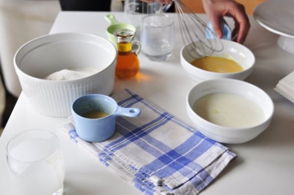 1. Suche składniki mieszamy w średniej misce. Jajko rozbijamy-białko dodajemy do maślanki, a żółtko ucieramy z roztopionym masłem i przelewamy do mleka.