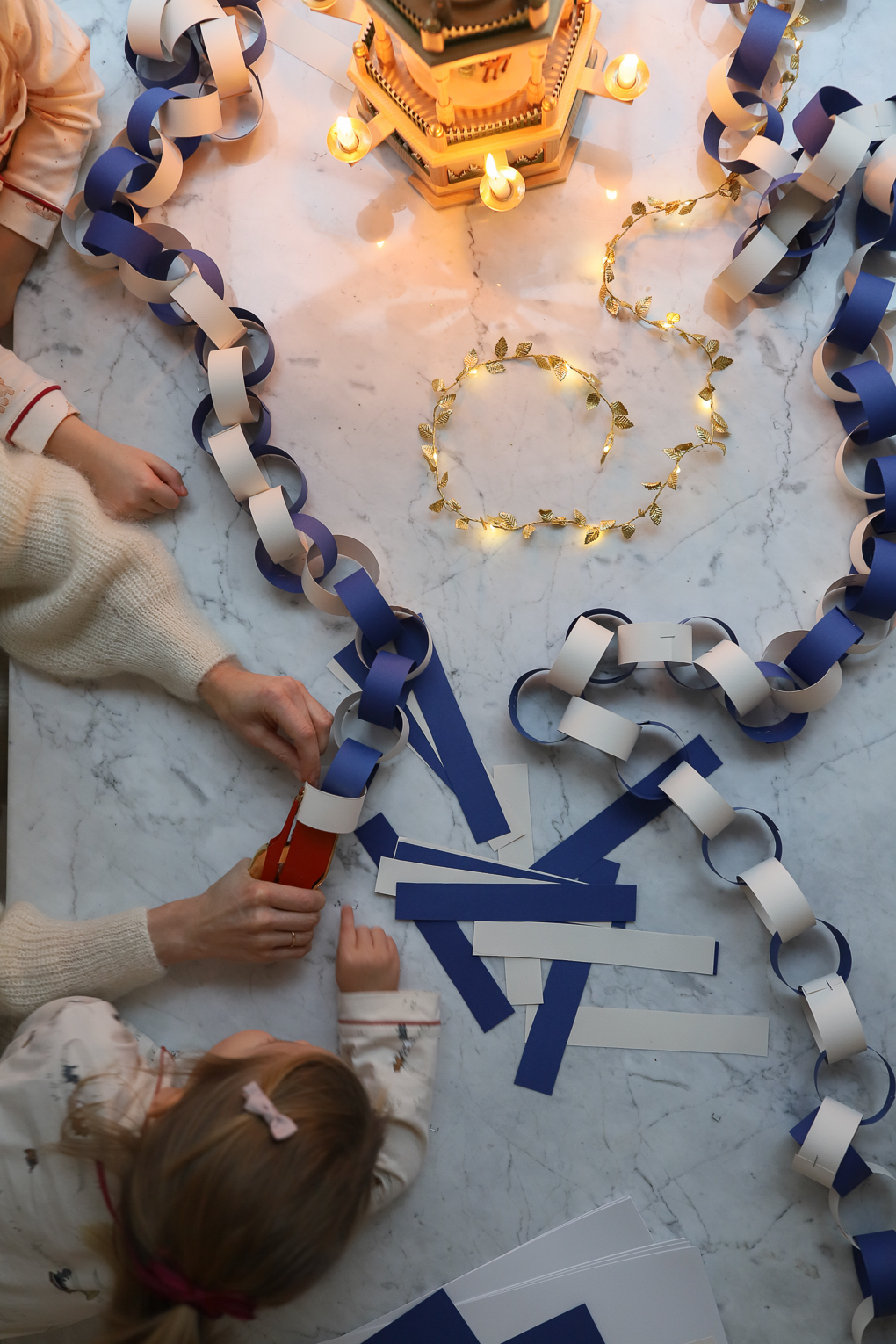 Tego typu aktywności są klasyfikowane jako „czynności manualne o niskiej złożoności”, które regulują układ nerwowy podobnie jak medytacja: spowalniają tętno, wyciszają korę przed-czołową odpowiedzialną za planowanie i kontrolę, a jednocześnie aktywują obszary mózgu odpowiadające za poczucie przyjemności i bezpieczeństwa. Współczesny mózg pracuje na obrotach, których dawne podręczniki neurologii w ogóle nie przewidywały – niech on też odpocznie w tym świątecznym czasie. Wystarczy godzina, aby stworzyć mniej więcej siedmiometrowy łańcuch. My robimy dwa: jeden jest pasków o szerokości 4 centymetrów (wygląda imponująco pod sufitem i jest bardziej pękaty) i drugi z pasków trzycentymetrowych. Polecam spinacz, bo klej jednak lubi puszczać w najmniej oczekiwanym momencie, na przykład wtedy, gdy pod łańcuchem cała rodzina je barszcz.