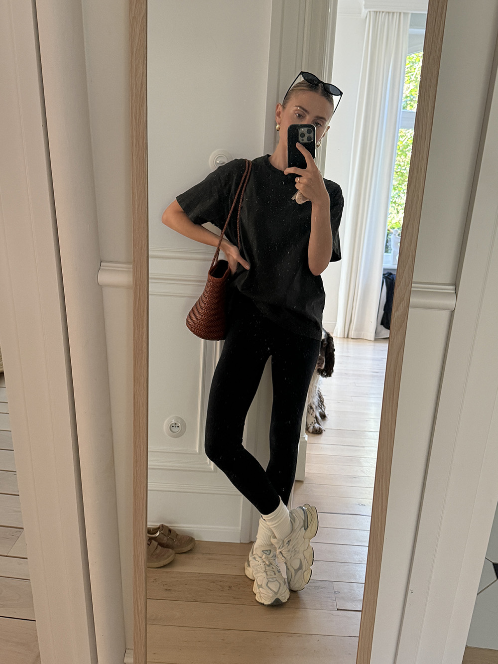 T-shirt – Weekday // legginsy – Oysho // torebka – L37 // buty – New Balance // okulary – Shevoke //