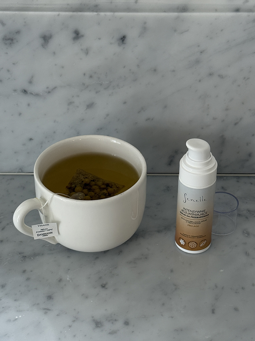 Dużo było tych wyjazdów we wrześniu z MLE, więc doceniałam, jak nigdy, te nieliczne dni, kiedy mogłam być w pracy będąc jednocześnie w domu. W jakimś sensie wspominałam wtedy wakacje – gdy jestem bez makijażu posłonoczne przebarwienia przypominają mi o tym, jak często zapominałam użyć SPF-u. Na szczęście w ostatnim czasie nauka poszła w tym temacie bardzo mocno do przodu. Kubek rumianku i intensywnie rozjaśniające serum na przebarwienia od Senelle. Ten kosmetyk to rewolucja w walce z plamkami i przebarwieniami posłonecznymi oraz potrądzikowymi. Dzięki unikalnej formule wzbogaconej o Potrójną dawkę witaminy C, Azeloglicynę, Alfa-arbutynę oraz inne składniki aktywne, serum: widocznie redukuje przebarwienia i niedoskonałości. Do tego głęboko nawilża i odżywia, przywracając naturalny blask i witalność (95% kobiet to potwierdziło – ale czy ich skóra widziała tyle słońca co Twoja? Nie wierz liczbom, sprawdź i sama się przekonaj). Kod MLE daje 20% rabatu na wszystkie produkty w sklepie Senelle.