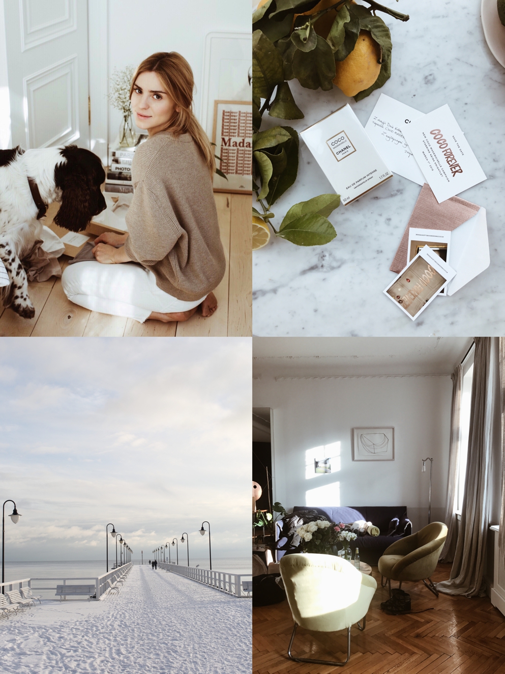1. Już wiem, że połączenie beżu i bieli będzie moim ulubionym w nadchodzącym sezonie. // 2. Ciężko teraz przywołać wspomnienia upalnych wieczorów pachnących trawą, moim ukochanym morzem i lemoniadą z dodatkiem czegoś mocniejszego… ale wiem, że prędzej czy później znów będziemy tańczyć pod gołym niebem. Coco Mademoiselle Intense pomoże mi przetrwać do tego czasu. // 3. Orłowskie molo całe w śniegu. // 4. Autorrooms w Warszawie. //