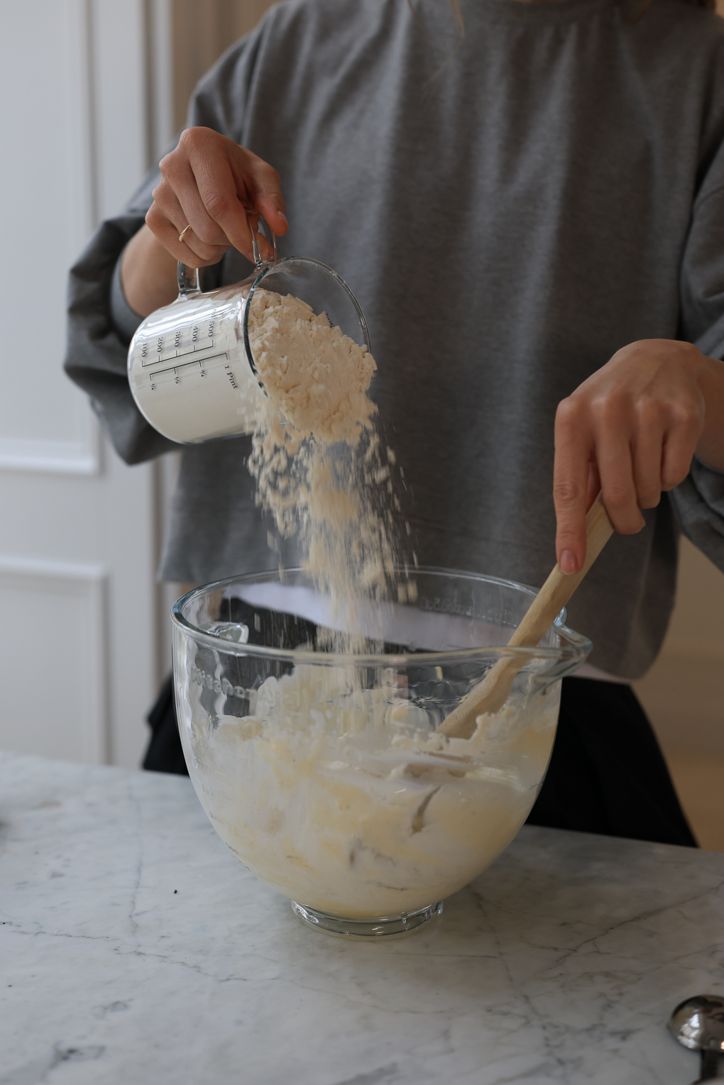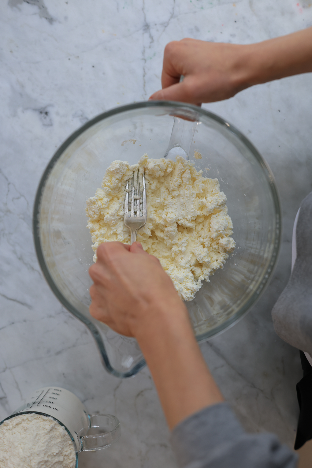 1. Rozgnieść w misce twaróg widelcem, dodać żółtka, cukier oraz wnętrze laski wanilii. Śmietanę wymieszać z sodą i również dodać do miski z twarogiem. Wsypać mąkę i wymieszać wszystkie składniki.