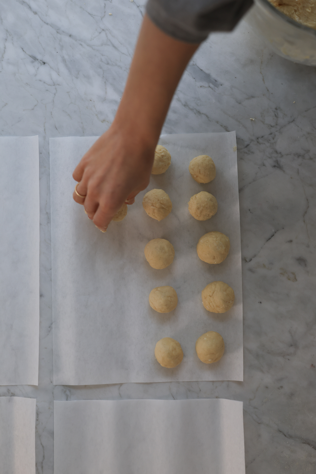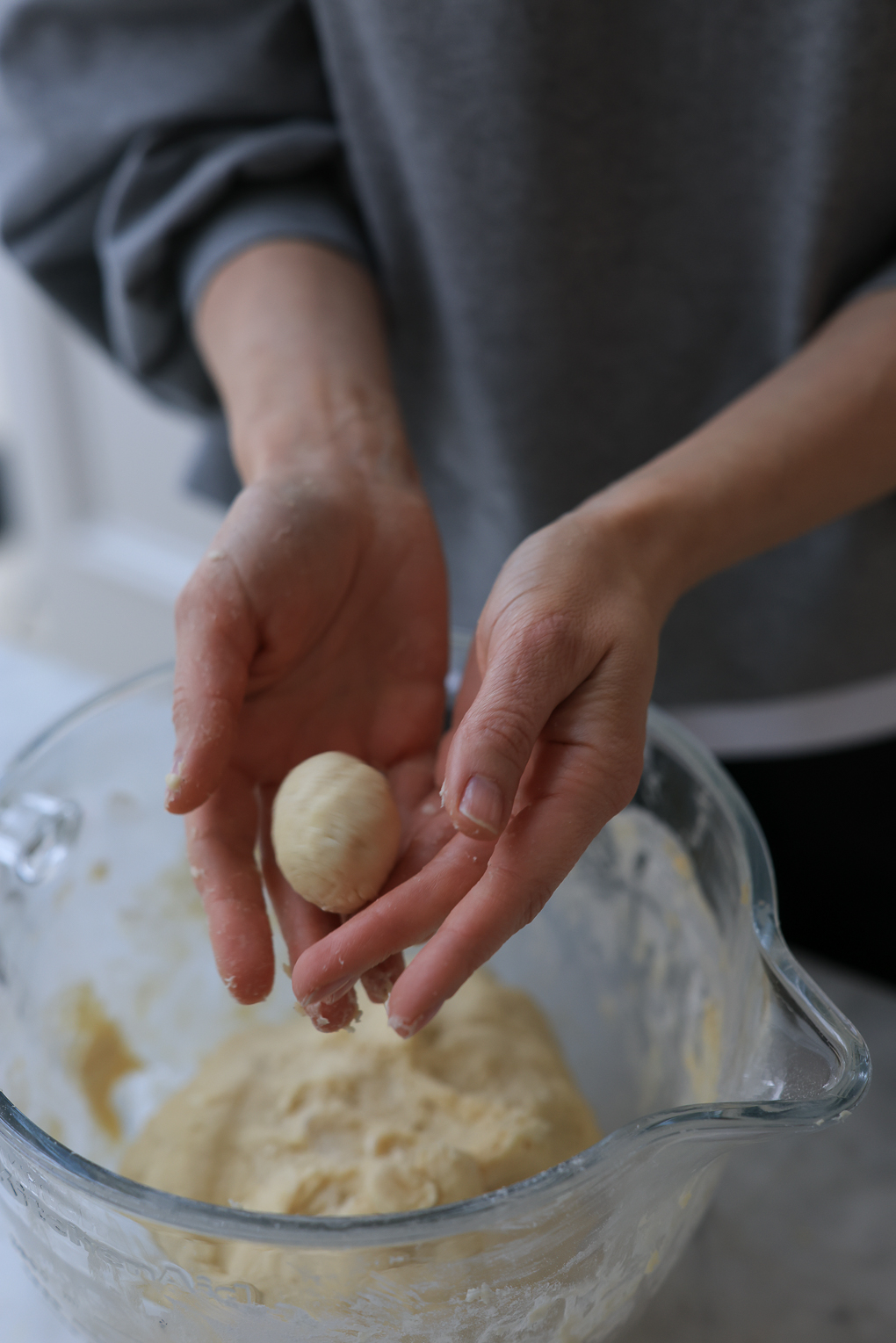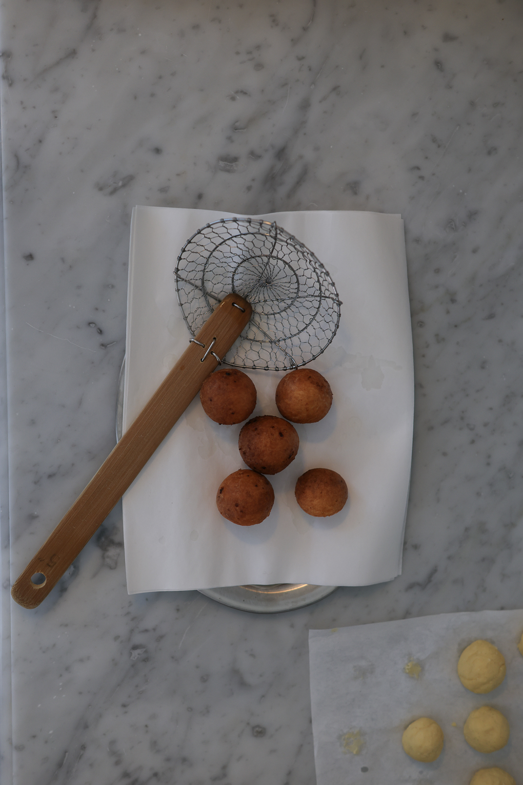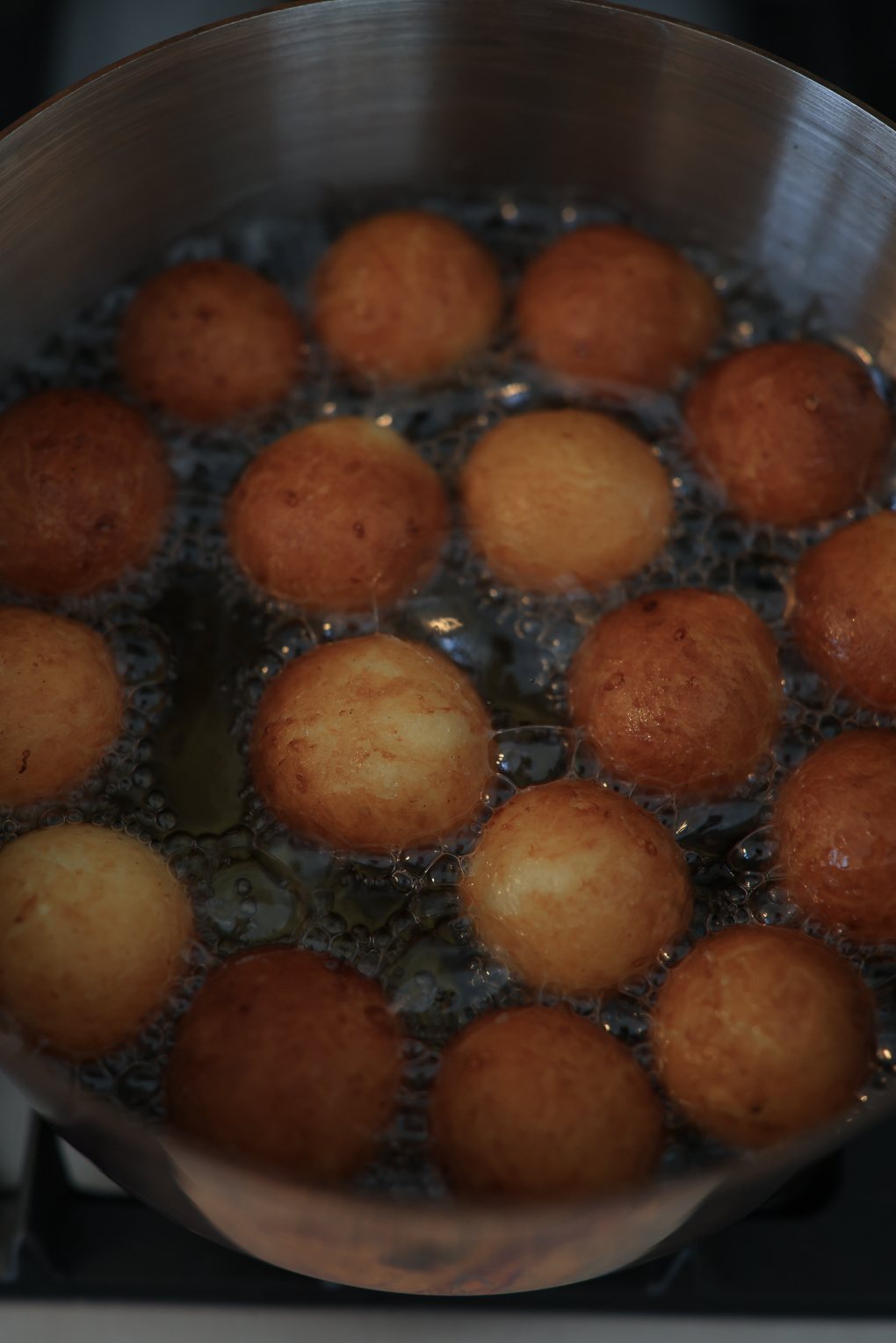 2. Wyłożyć masę na stolnicę i krótko zagnieść powstałe ciasto. Podzielić je i ulepić z nich kulki wielkości orzecha włoskiego. Do szerokiego, dużego garnka wlać olej i rozgrzać do 180 stopni. Partiami wkładać pączki, tak aby każdy miał odstęp.