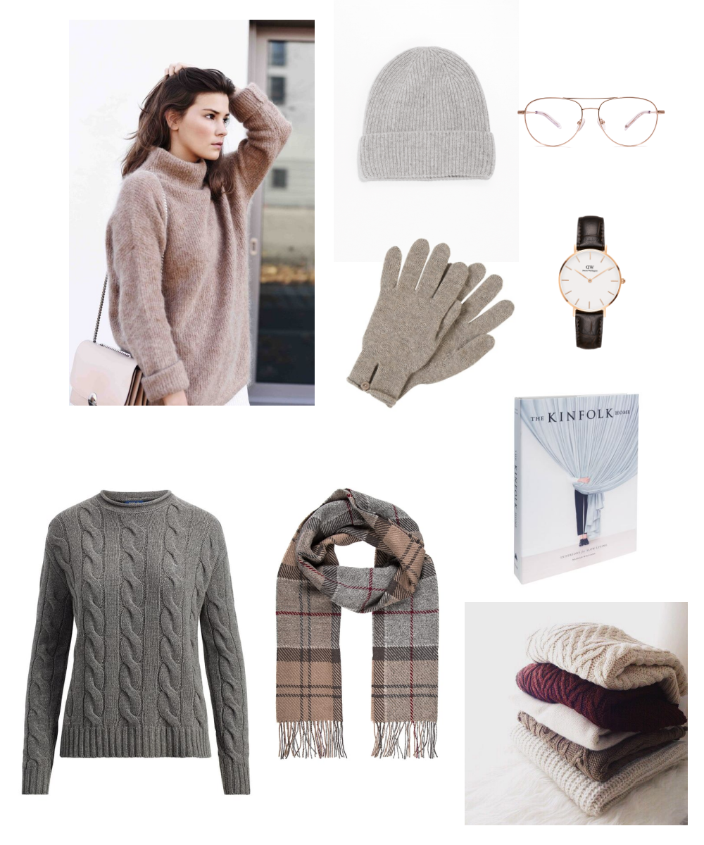 1. Czapka – & Other Stories 200zł (100% kaszmir) 2. Okulary – Muscat 350zł 3. Rękawiczki – Johnstons of Elgin 209zł (100% kaszmir) 4. Zegarek – Daniel Wellington 515zł 5. Książka – The Kinfolk Home 130zł 6. Szalik – Barbour 299zł (95% wełna, 5% kaszmir) 7. Sweter – Polo Ralph Lauren 589zł (90% wełna, 10% kaszmir)