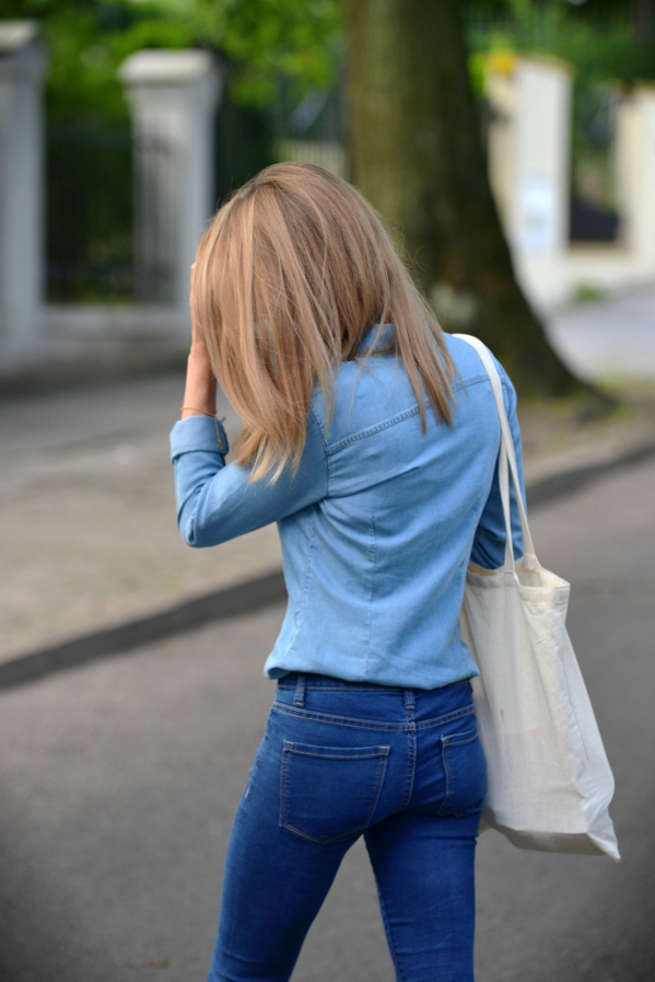 Jeśli któraś z Was, przemierzając wczoraj ulice Trójmiasta, natknęła się na niewysoką blondynkę, ubraną od stóp do głów w jeans, to prawdopodobnie byłam ja:). Płaskie buty, jeansy, luźna koszula i szmaciana torba, to dobrze uzupełniejące się elementy, zwłaszcza gdy nie mamy ochoty zakładać czegoś eleganckiego i niewygodnego :). Gdybym jednak zdecydowała się na bardziej wyszukany look, to cieliste szpilki i elegancka torebka też powinny dobrze wyglądać z tym jeansowym strojem. I na pewno niebawem się o tym przekonam :).