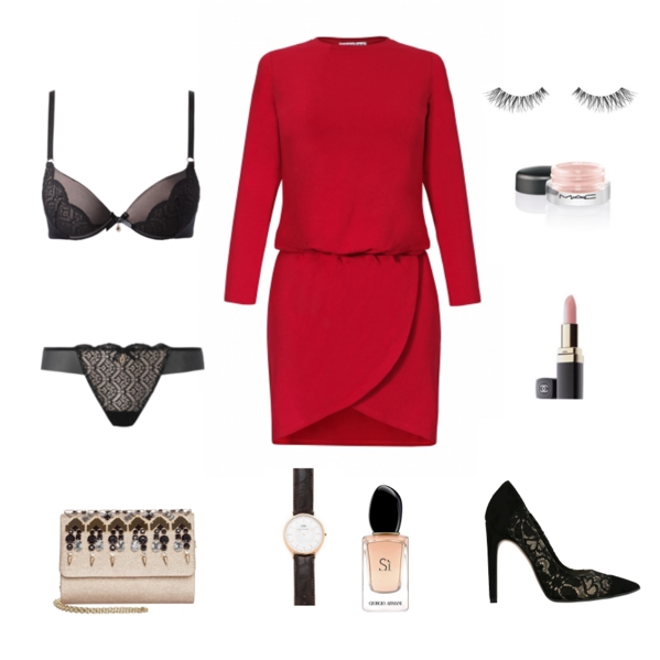 1. Figi – Intimissimi 2. Biustonosz – Intimissimi 3. Sukienka – Sugarfree 149zł 4. Sztuczne rzęsy – Douglas.pl 27,90 5. Cienie do powiek – MAC 80zł 6. Pomadka – Chanel 7. Szpilki – Zalando 262zł 8. Perfumy – Giorgio Armani 259zł 9. Zegarek – Daniel Wellington 670zł 10. Kopertówka – Menbur