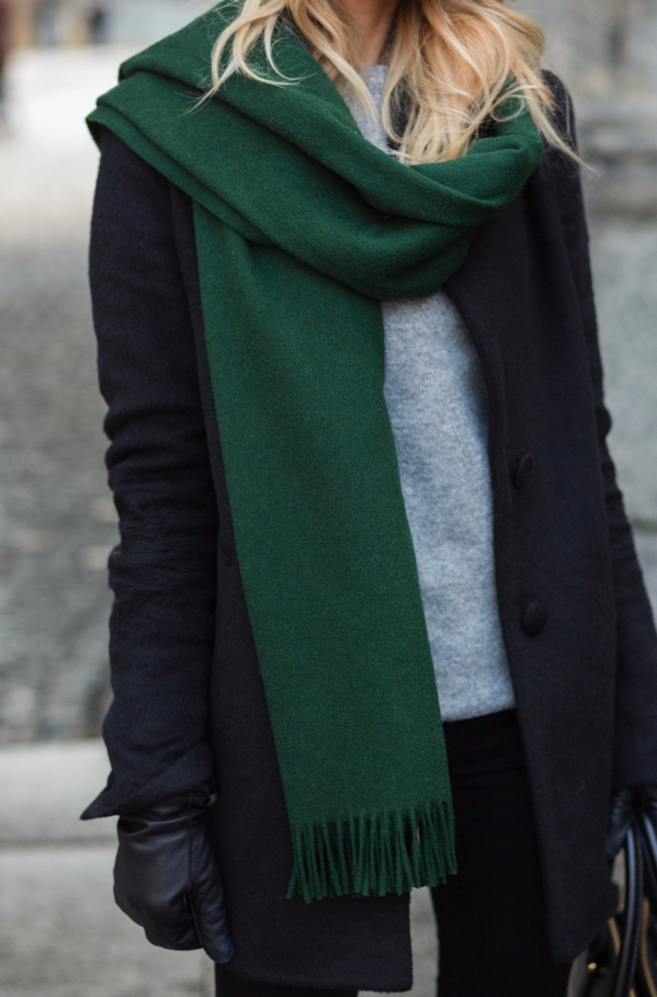 Czarny kolor to niewątpliwie póśjcie na łatwiznę. Właśnie dlatego noszę go z taką chęcią – wygląda elegancko, pasuje do wszystkiego. Poza tym, późną jesienią i zimą mocne kolory mogą prezentować się trochę ekscentrycznie i wymagają dużego wyczucia. Czerń wydaje się więc naprawdę bezpiecznym rozwiązaniem, pod warunkiem, że wprowadzimy detale, które dodadzą chociaż trochę świeżości do naszego stroju. Biżuteria, złote guziki płaszcza, okucia przy torebce, albo okulary przeciwsłoneczne nadadzą całości luksusowego charakteru, ale moim ulubionym sposobem jest oczywiście zarzucenie szala w innym kolorze (ten zielony mógłby równie dobrze sprawdzić się jako koc, jest tak wielki i puszysty, że najchętniej w ogóle bym go nie ściągała). A Waszym zdaniem czerń jest wyrafinowana, czy może nudna?