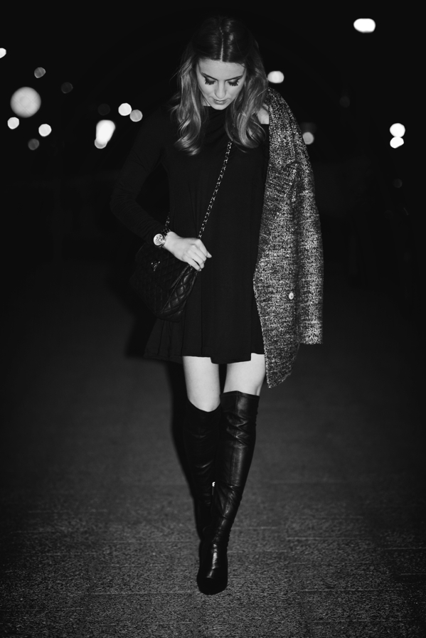 W trakcie prowadzenia bloga weszłam w posiadanie wielu wieczorowych sukienek, wysokich szpilek i malutkich torebeczek. Zadbałam też o to, aby nie zabrakło mi swetrów, luźnych t-shirtów i bluz, w których chodzę na co dzień. Gdy jednak musiałam się ostatnio wyszykować na normalną imprezę (od ostatniej, na której byłam minął chyba rok) okazało się, że nie mam się w co ubrać. Na nic były mi koktajlowe kreacje (w klubie wyglądałabym w nich po prostu śmiesznie), puzderka bez paska, czy łańcuszka (zgubiłabym je w pięć minut), nie mówiąc już o moich ukochanych bluzach. Wybawieniem okazała się niezastąpiona mała czarna, o której w szale tworzenia nowych stylizacji, zdążyłam kompletnie zapomnieć. Założyłam do niej wysokie kozaki, płaszcz i klasyczną torebkę. Kilka dni później wybrałam ją jako strój dzienny – z kryjącymi rajstopami, sztybletami i camelowym płaszczem, a gdy przyjdzie lato połączę ją z płócienną torbą i sandałkami. A Wy co dziś na siebie założyłyście? :)