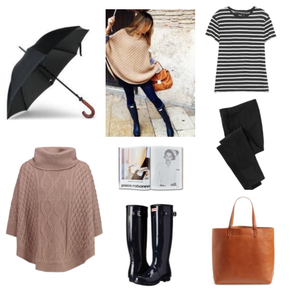 1. Parasol – Fulton 100zł 2. Ponczo – Anna Field 139zł 3. Magazyn – The Gentelwoman 4. Buty – Hunter 600zł 5. Torebka – Street Level 205zł 6. Legginsy – MLECollection 139zł 7. T-shirt – H&M 19,90zł