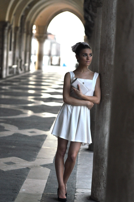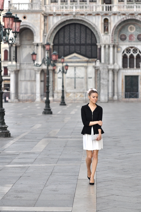 W trakcie pobytu w Wenecji, tylko raz zamieniłam wygodne baletki i klapki na moje ukochane szpilki. Połączenie czerni i bieli to klasyka, która zawsze prezentuje się dobrze (tyczy się to także bardziej eleganckich stylizacji). Sukienka odcięta w pasie, to mój ulubiony fason – idealnie komponuje się z dobrze dopasowanym żakietem z baskinką.