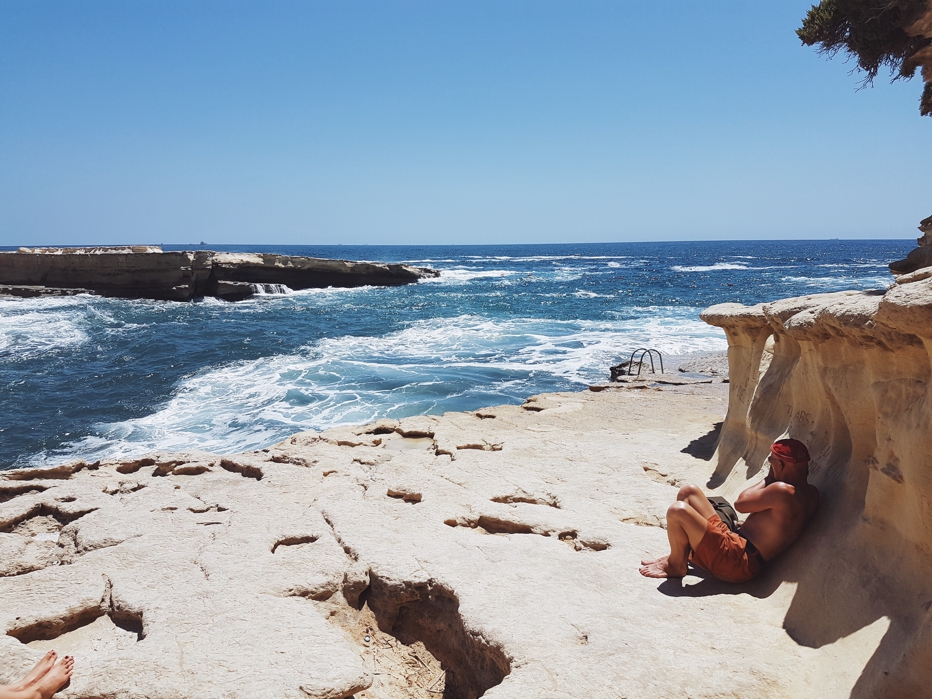 Naszym ulubionym miejscem okazała się być plaża (a właściwie skała) St. Peter's Pool mieszcząca się niedaleko miasteczka Marsaxlokk (to właśnie tu chciałam wyczekiwać na rybaków). Po czterdziestominutowym spacerze ujrzałyśmy malutką zatokę z jasnej skały i krystalicznie czystą wodę. Ku naszemu zdziwieniu było tam naprawdę niewiele ludzi – w zasadzie można ich było policzyć na palcach jednej ręki. Szybko zorientowałyśmy się skąd te pustki. Fale były na tyle silne, że kąpiel byłaby naprawdę niemądrym pomysłem. Mimo tego postanowiłyśmy tam zostać i przez kilka godzin korzystać ze słońca. Towarzyszył nam zafascynowany widokiem morza włoski fotograf i pies, który wyglądał trochę jak krótkowłosy Portos.